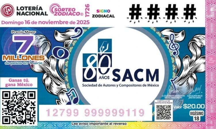 El 80° Aniversario de la Sociedad de Autores y Compositores de México (SACM) recorrerá el país en el billete del Sorteo Zodiaco No. 1726 de Lotería Nacional, que reconoce su labor en la protección de las obras intelectuales, su vínculo con la música, la identidad nacional, la cultura de la legalidad y la justa retribución para quienes ejercen esta profesión.